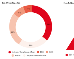 L’étude constate que le marché des fonctions compliance se diversifie et se partage entre des métiers très spécifiques, comme ceux de Data privacy officer (DPO) et d’autres plus généraux comme ceux de « responsable conformité ». En 2018, 35 % des représentants de la fonction compliance étaient des « juristes/compliance officers ». Quelque 26 % sont regroupés sous des intitulés de postes variables : risk manager, RCSI, contrôleur interne, etc. L’intitulé de poste plus général de « responsable conformité » concerne quant à lui 23 % des personnes interrogées et les postes à responsabilités de DPO et de RCCI (Responsable de la conformité et du contrôle interne) concernent respectivement 7 % et 9 % du marché.